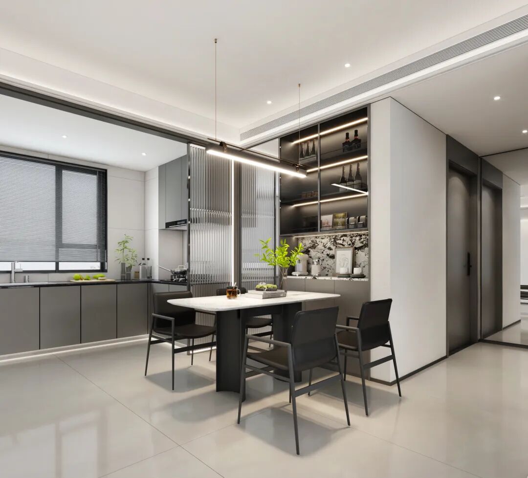 约5.4米轩敞横厅,餐客一体设计,打破传统客厅的功能边界。此处可为父亲的临时办公区,可为孩子的乐高天地,亦可为长辈的品茗角落。当厨房、餐厅、客厅真正融为一体,烹饪者不再孤单,玩耍的孩童尽在视线之内,家人的情感于无形中交融升温。周末时光,此处更成为家庭的社交主场,亲朋欢聚、家族宴会,亦游刃有余。