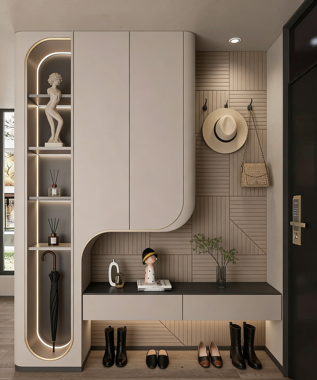 深谙收纳之道,项目在约108㎡空间之内,巧妙植入N+灵动储物区域。或隐于玄关转角,让包袋、钥匙、快递皆有归属;或藏于过道墙面,化身独立储物空间,吸尘器、挂烫机、孩童玩具车皆可有序归置。当居所告别杂乱,生活自然多一份从容。